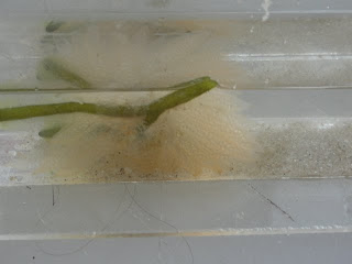 Drag a net through the water and you never know what you might find….This little clump is actually a clump of squid eggs. Female squid lay their eggs in long “candles” which are attached to something on the ocean floor such as a rock, shell or seaweed. Other female squid may add their own candles and each clump may actually have eggs from many different squid. When you find these on the beach or in tide pools they look sort of pinkish and feel squishy like jellyfish. They can be quite a bit larger than the one shown here.