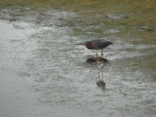 Little green herons, commonly just called green herons these days are probably one of the most common birds to see around ponds and marshes and yet they get overlooked and misidentified on a regular basis. At this time of year it is not uncommon to see 4 or 5 of them at a time as young birds have left their nests and are feeding near the areas they were brought up in. Soon they will become more solitary and many will migrate though some will stay quite late into the fall. These birds stand about a foot high and are most commonly mixed up with bitterns, which are much more secretive. The other bird in these pictures is a greater yellowlegs. More on them in the next few days.
