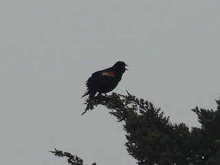 In the fog and gray their colors were not as distinctive or bright as they will be on a bright sunny day but you can still see this fellow’s red epaulet as he lets everyone know he’s in the area.