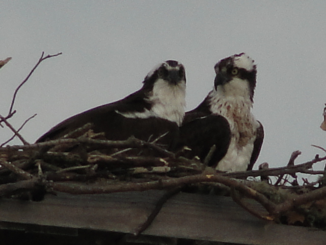 Over the years ospreys have been in the neighborhood but have never successfully nested here. In fact, there were several unfortunate nesting attempts that ended badly due to, shall we say, electrical complications….The power company has now added a safe platform for the birds and although they attempted nesting here last year it was not successful. This year, the pair has been actively adding to the nest and has been seen copulating so we are hoping there will be eggs soon.