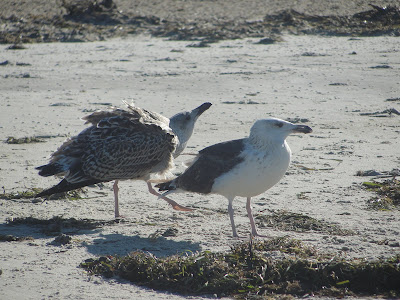 If you look at the picture closely you may notice a dead fish a little left of center. There are two black backed gulls–an adult and a juvenile and the juvenile is in a threatening stance and is calling loudly, letting the adult know that this is ITS fish and it has no intention of sharing….