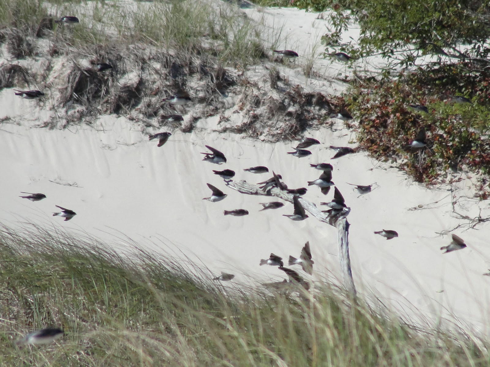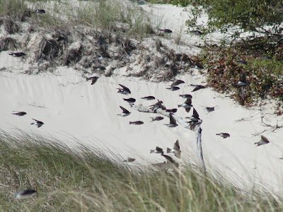 For the next few weeks you should be able to see an amazing sight–tens of thousands of swallows gathering and staging in the dunes along the Cape shores. See all those little black dots on the sand? Those are swallows–mostly tree swallows though you may see others mixed in as well….