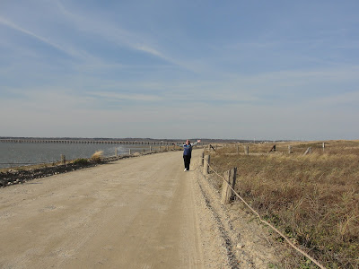 We walked on the beach side and also along this dirt road that ran along the backside of the dunes and along the harbor. We knew the owl would most likely be way out and when we saw someone with a big scope and camera coming off the trail from up ahead we asked if they had seen the owl. Indeed they had. It was on the beach side and down about a mile or so. He said we’d see the people watching it.
