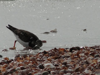 One of the first shorebirds I could identify for sure as a kid was a ruddy turnstone. They have very distinctive markings, are not very shy and if you watch them long enough they do exactly what their name suggests. They turn over stones to look for food.These guys were found at Dowse’s Beach in Osterville this week. There were about a dozen mixed in with the local winter sanderlings. Turnstones don’t generally winter here though they are seen sporadically. I don’t know if these have been here all winter or if they are early arrivals on their way north. They are in winter plumage that is turning.