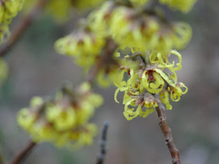 If you are prone to tromping around the woods at this time of year on the Cape you might come across this lovely little tree. It has smooth bark and the stems grow up and out as if forked which is one of the ways it got its common name. The word witch comes from”wych”(not witch) and is actually an old English word describing a stick that has a pair of flexible forked branches. The “Hazel” part of the common name comes from the resemblance the leaves have to those of the hazelnut.Witch hazel is a funny bloomer and not always predictable. Often they will bloom in February if there is a warm spell but some bloom late in the fall and others bloom quite a bit later in the spring.