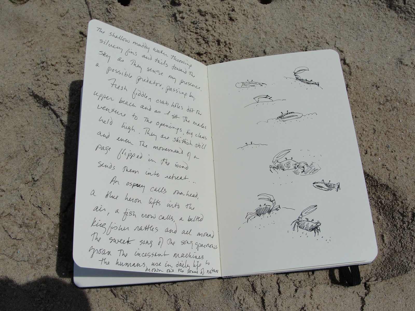 and as I sat quietly in the sand making notes of the birds and plants around me the fiddler crabs came out to play.